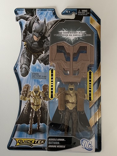 Batman The Dark Knight Rises QuickTekMissile Armor Batman FigureInspired by the hit Batman film, The Dark Knight Rises. can gear up like Batman and fight the villains of Gotham City Instantly change into fighting gear with an arsenal of weapons and accessories. Includes one figure and QuickTek accessories. Bringing out the Missiles.